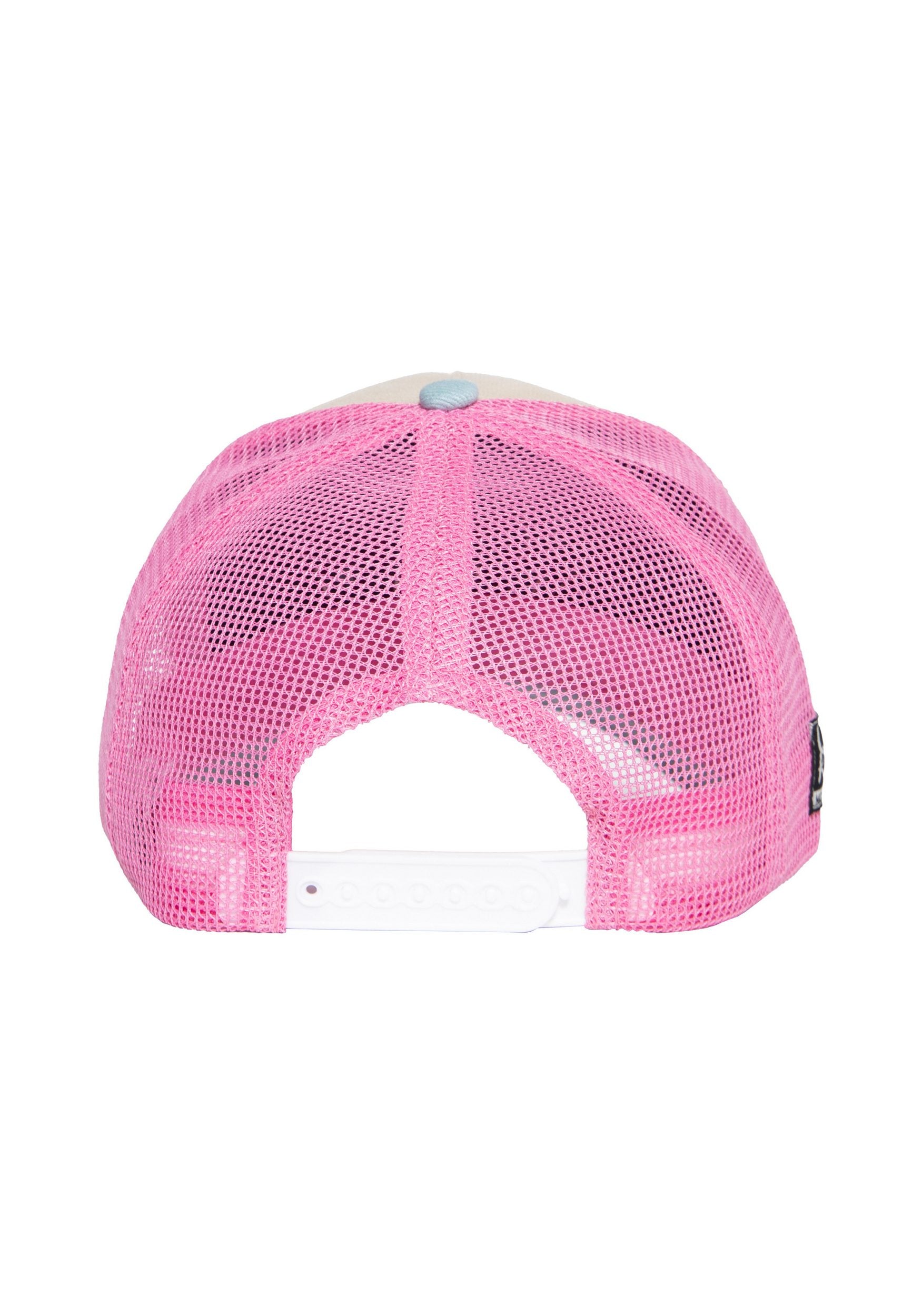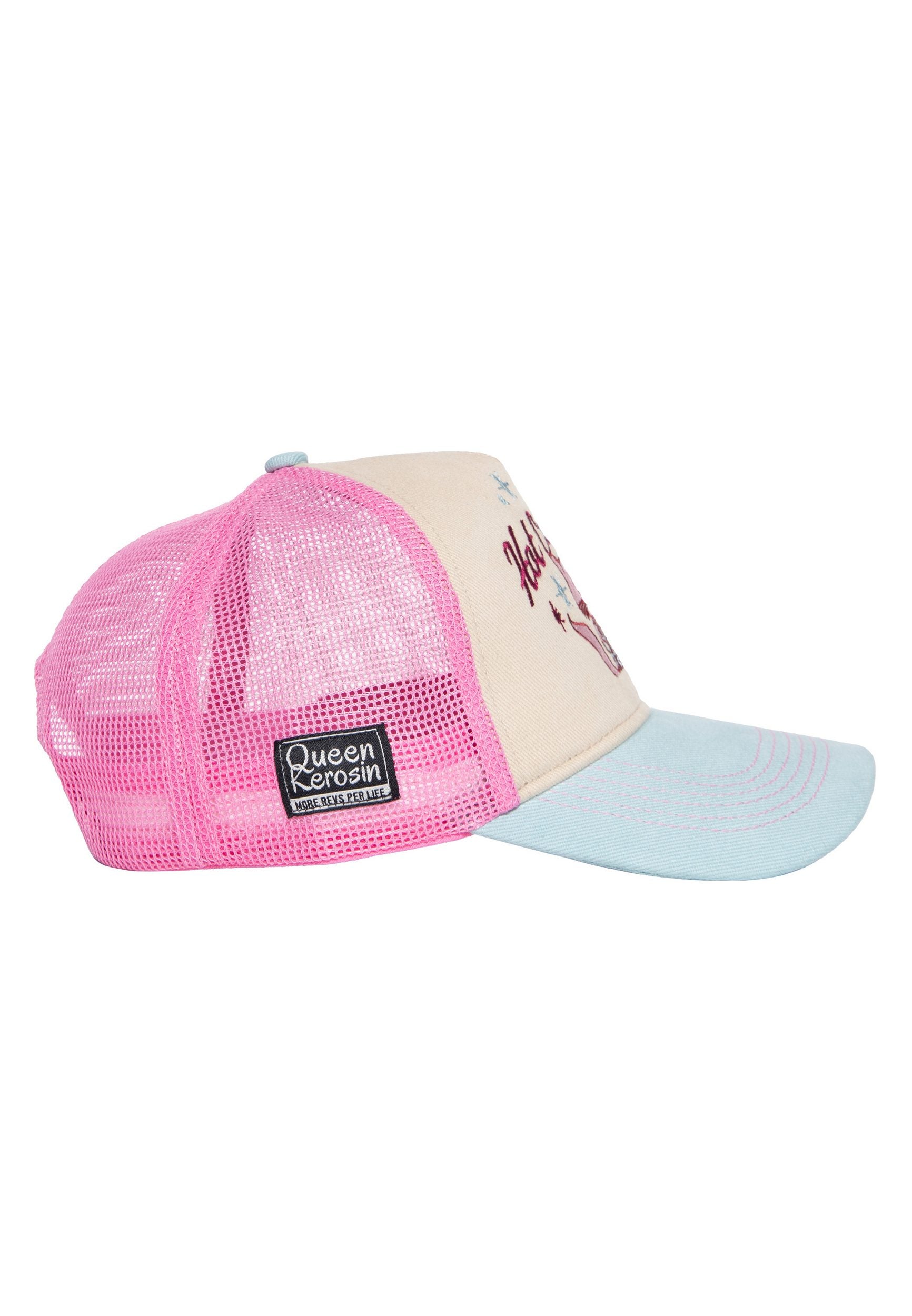 Diese Trucker Cap von Queen Kerosin ist ein stylisches Statement-Piece, das den frechen Charme und den Geist der 50er Jahre Rockabella-Szene einfängt. In einem verspielten Farbmix aus Rosa, Hellblau und Beige präsentiert sich diese Cap, die sofort ins Auge fällt und nostalgische Vibes versprüht.