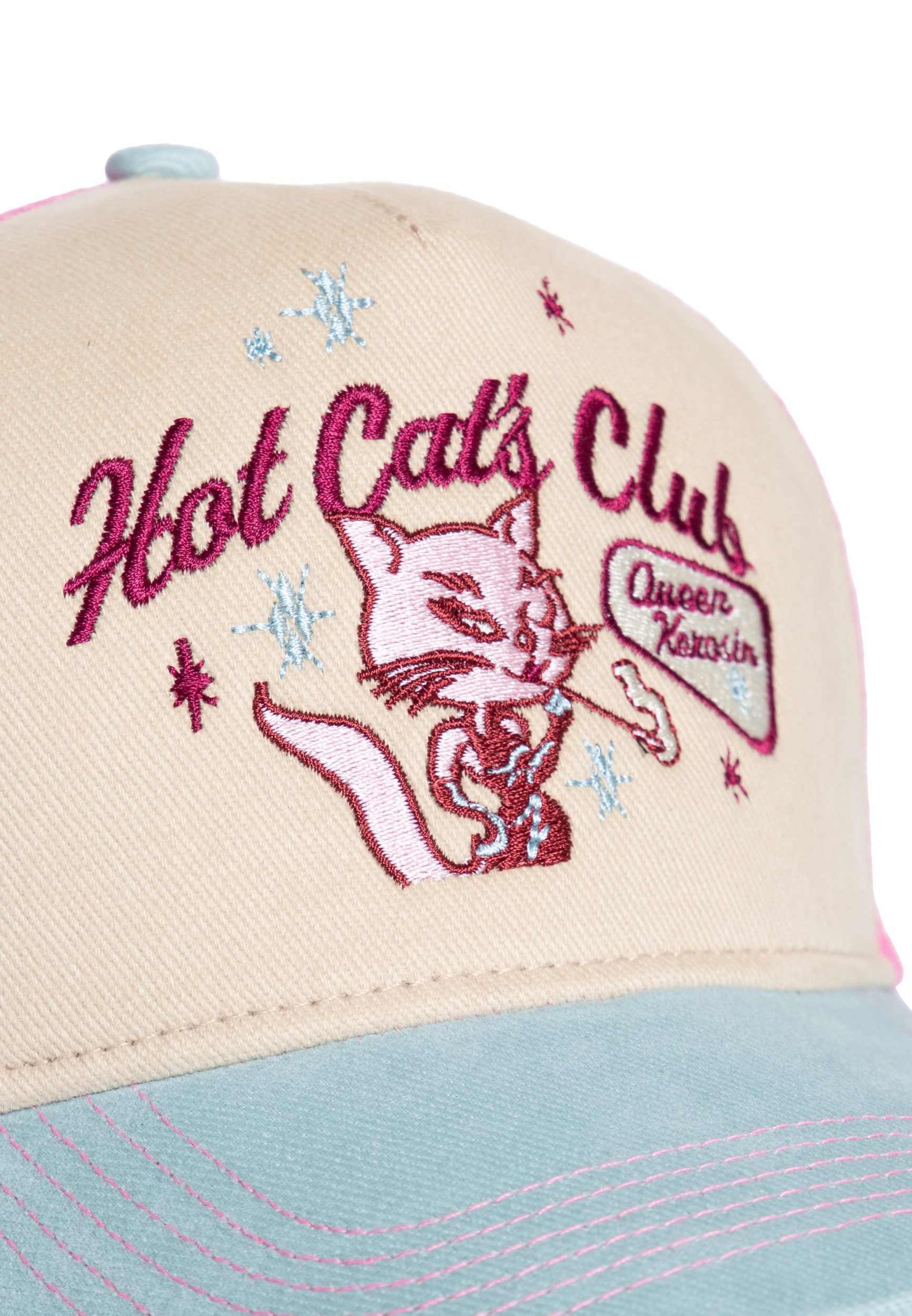 Die hochwertige Stickerei auf der Front zieht mit dem "Hot Cats Club"-Schriftzug und der Darstellung einer Katze alle Blicke auf sich. Die Kombination aus angenehmen Baumwolltwill und einem luftdurchlässigen Netzeinsatz sorgt für optimalen Tragekomfort, während der verstellbare 7-Loch-Verschluss eine individuelle Passform ermöglicht.